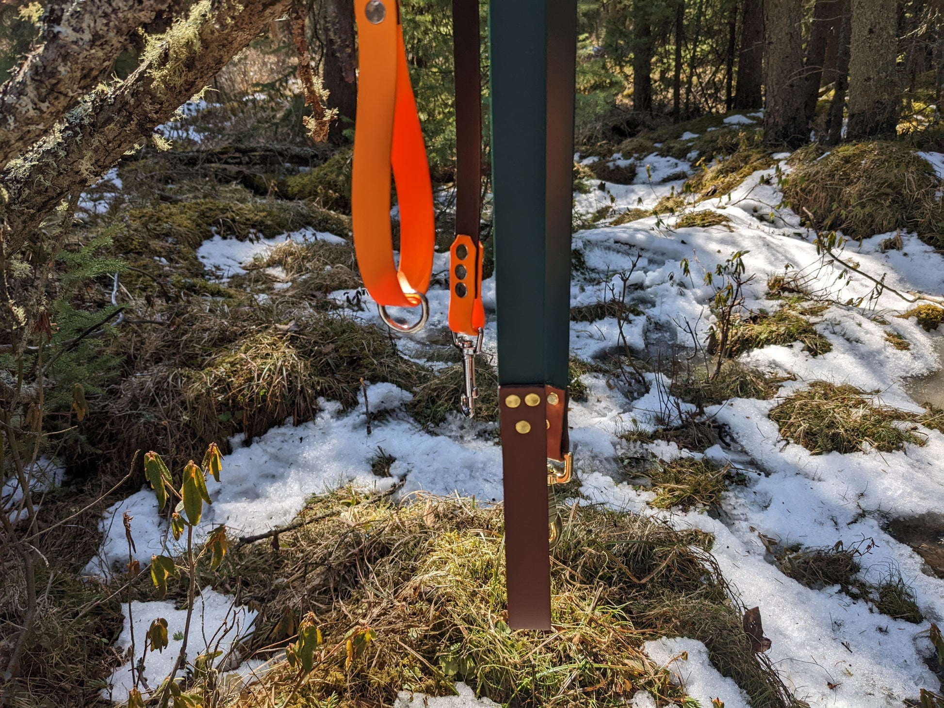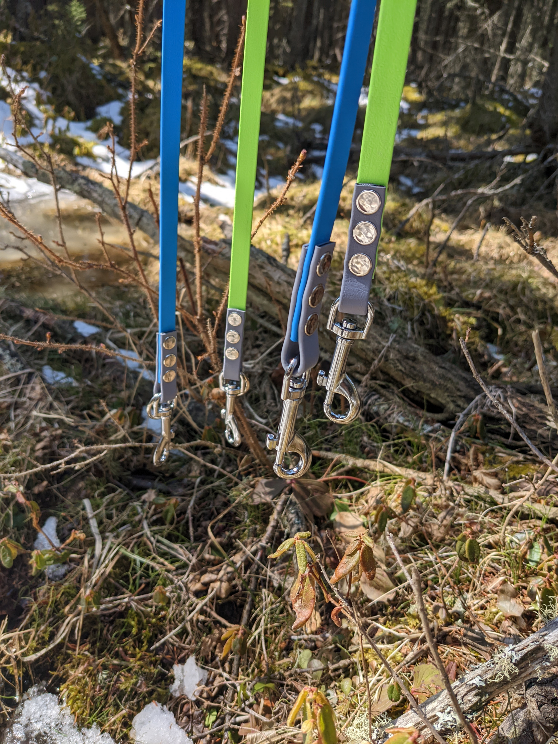 Our leashes are made with Biothane, a strong rugged material that cleans up extremely easy with soap and water. Soft and almost leather like to the touch, and lightweight. A suitable choice for a vegan option.