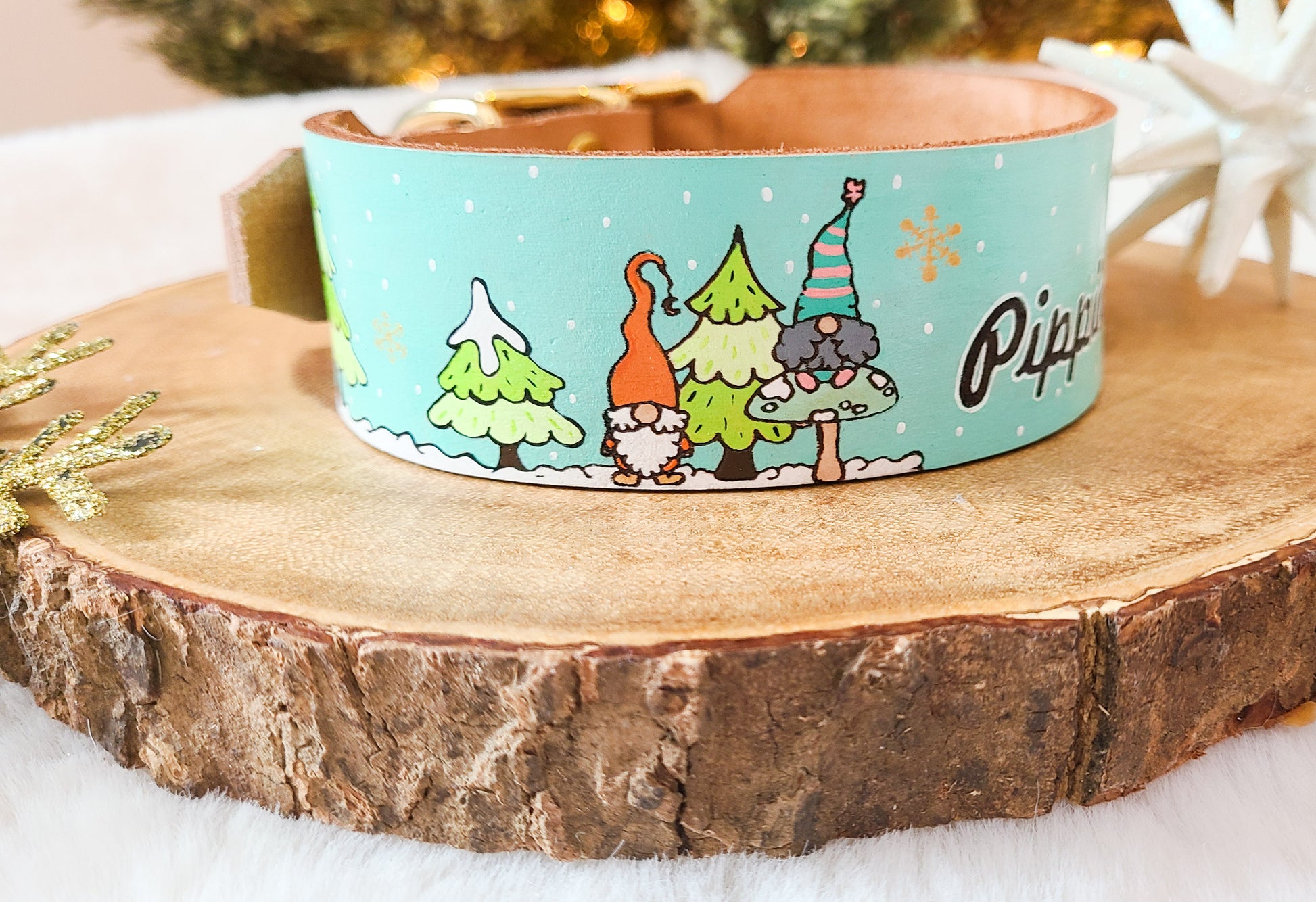 Custom handmade Leather collar with our adorable Holiday gnome design.