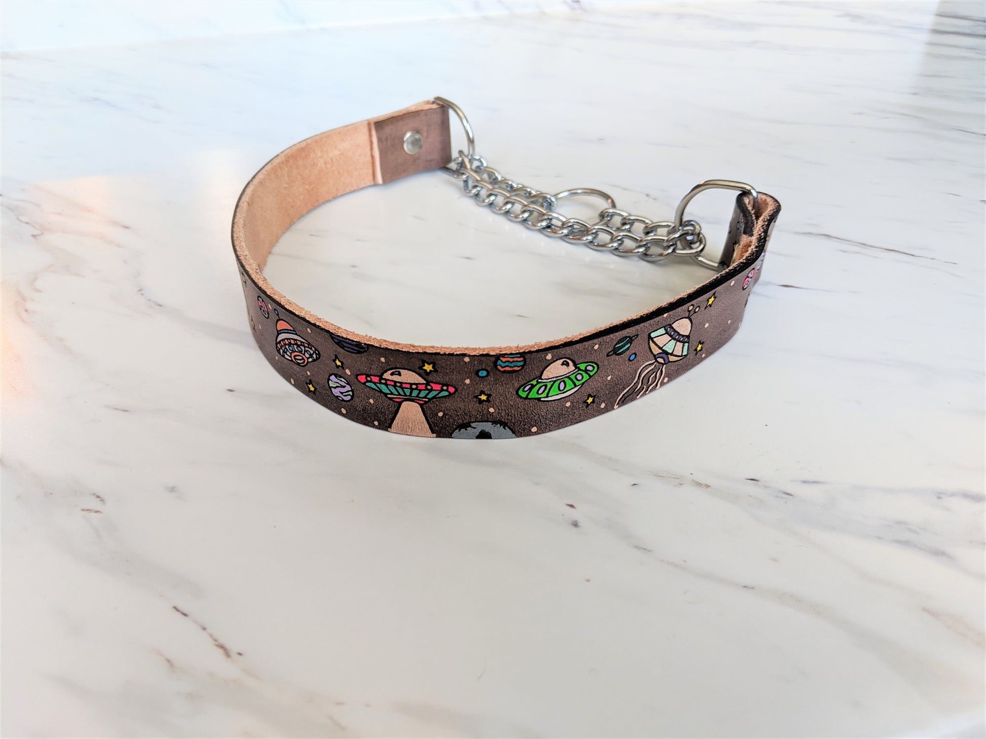 UFO Alien Spaceships - Leather Martingale Dog Collar