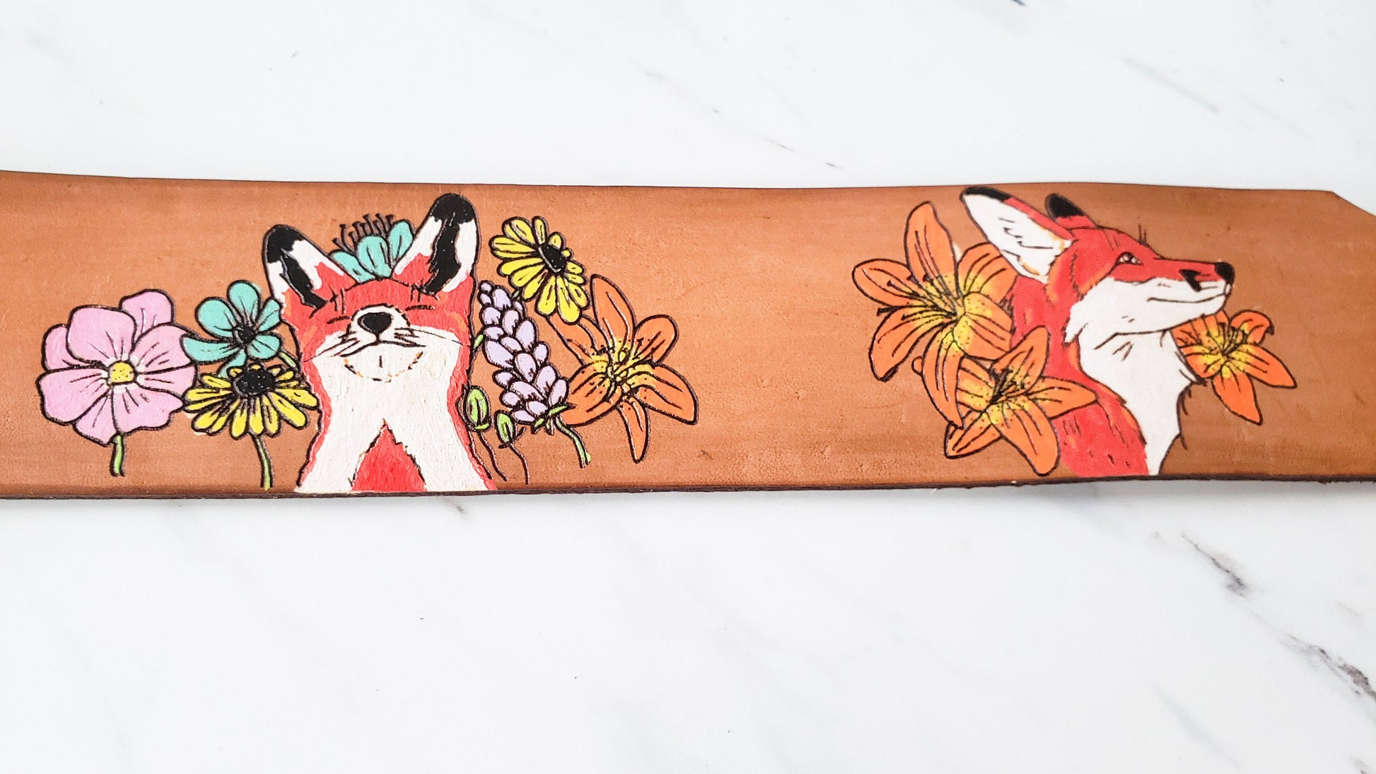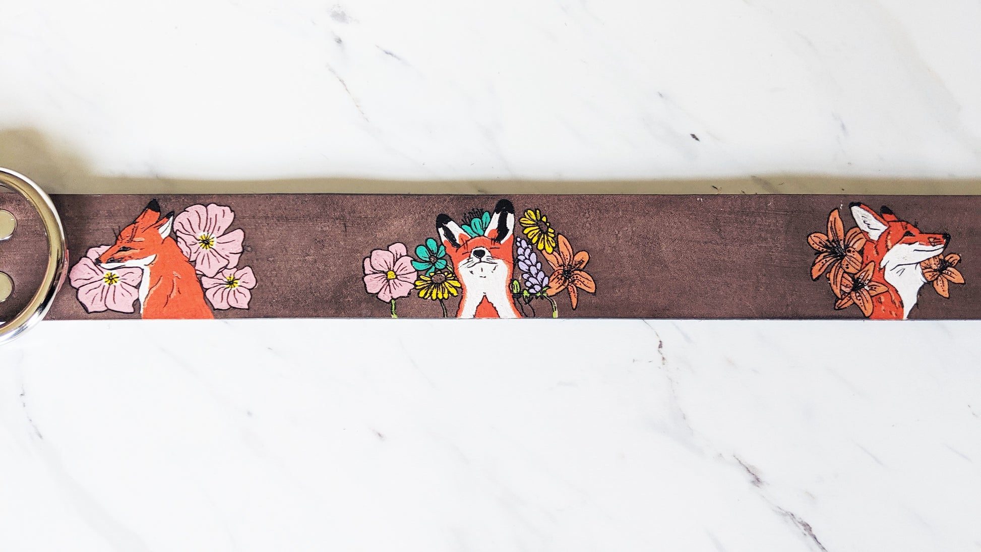 Custom handmade Leather collar with our Frolicking Fox design with three cute foxes within some flowers.