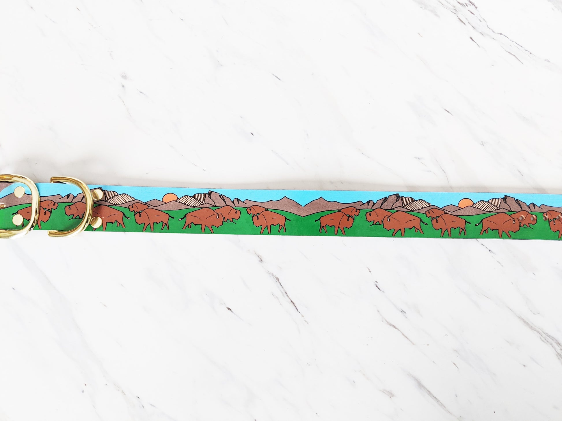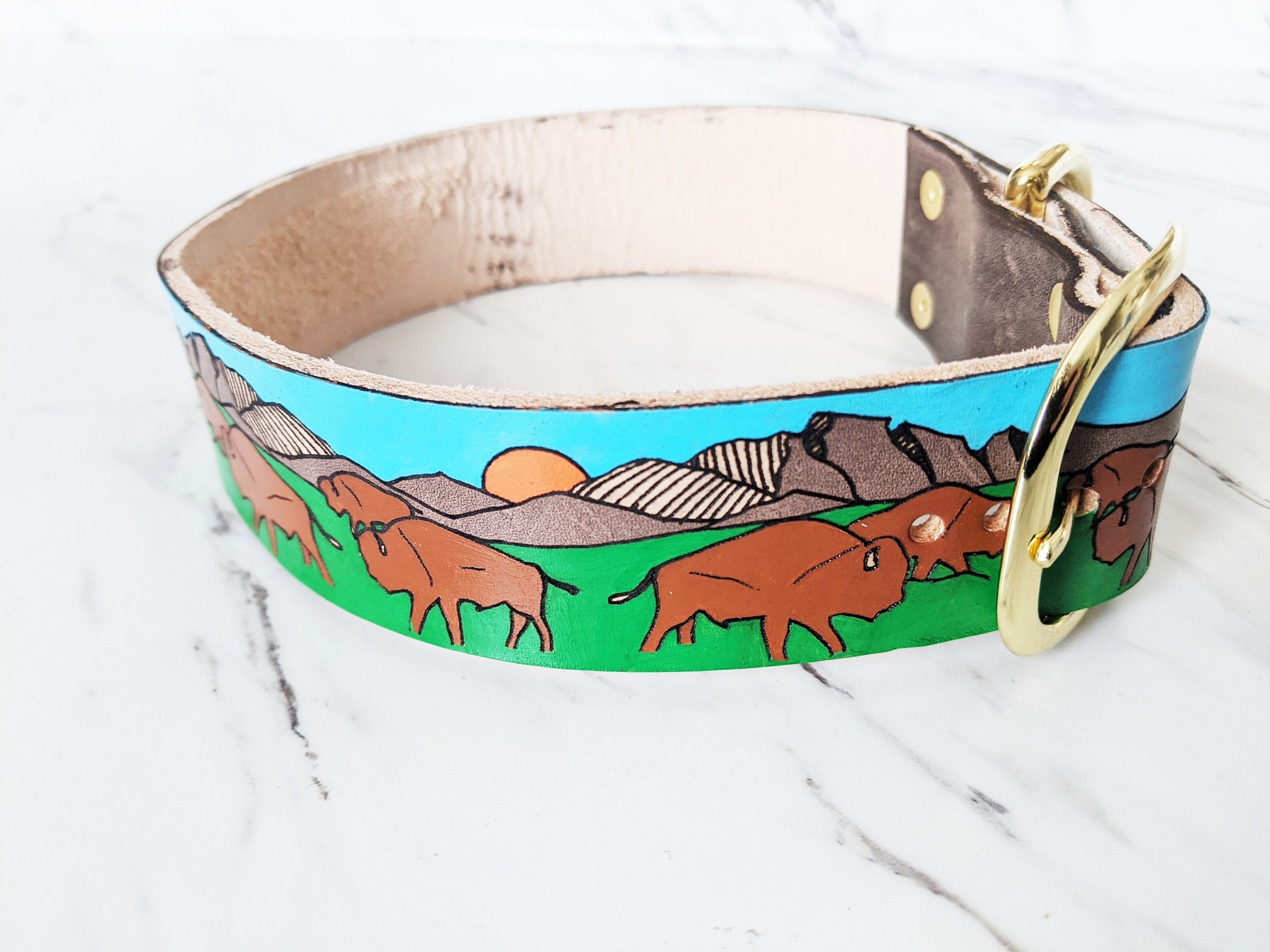 Custom handmade Leather collar with our Roaming Buffalo design.