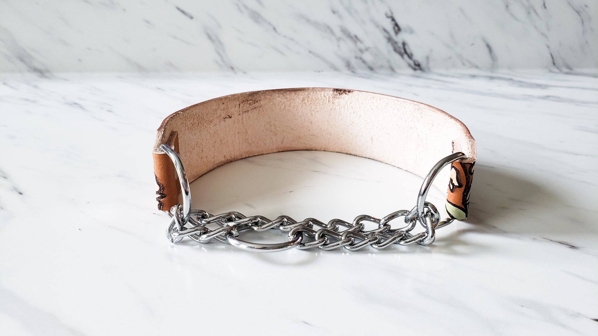 Made from high quality, thick vegetable tanned cowhide. All of our collars that have bright colors are hand painted with some of the best leather paints out there. Our base colors are dyed with antique gels. All dyes and paints are eco friendly and non toxic, just in case your dog decides his new collar is now a chew toy.