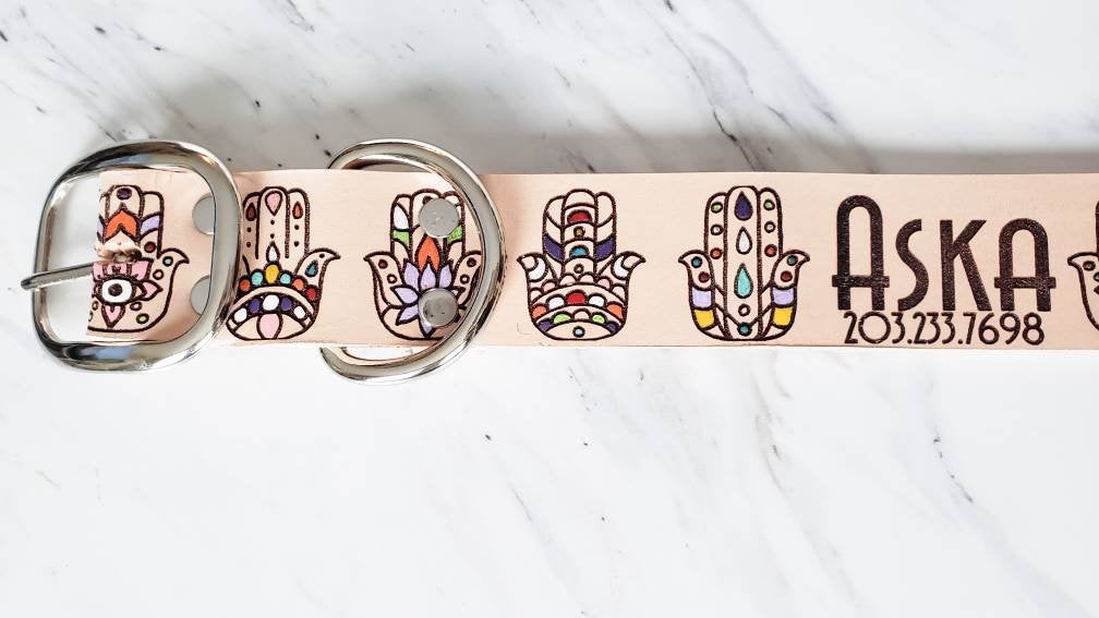 Made from high quality, thick vegetable tanned cowhide. All of our collars that have bright colors are hand painted with some of the best leather paints out there. Our base colors are dyed with antique gels. All dyes and paints are eco friendly and non toxic, just in case your dog decides his new collar is now a chew toy.