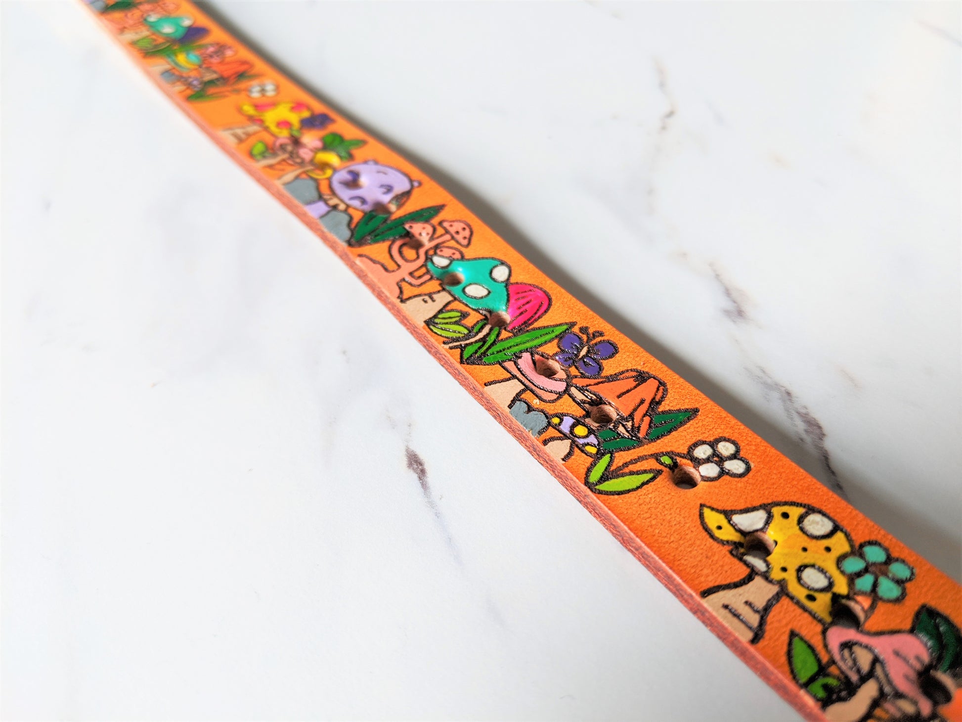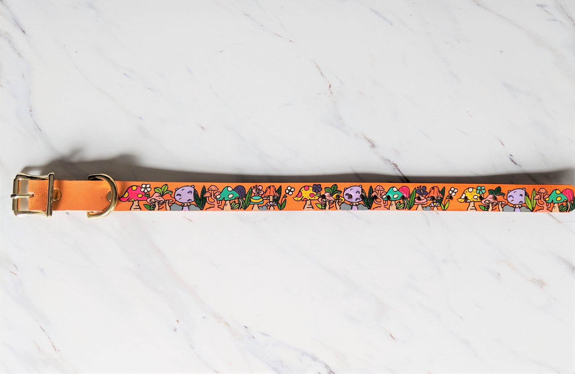 Custom handmade Leather collar with our magical field of Mushroom Madness.