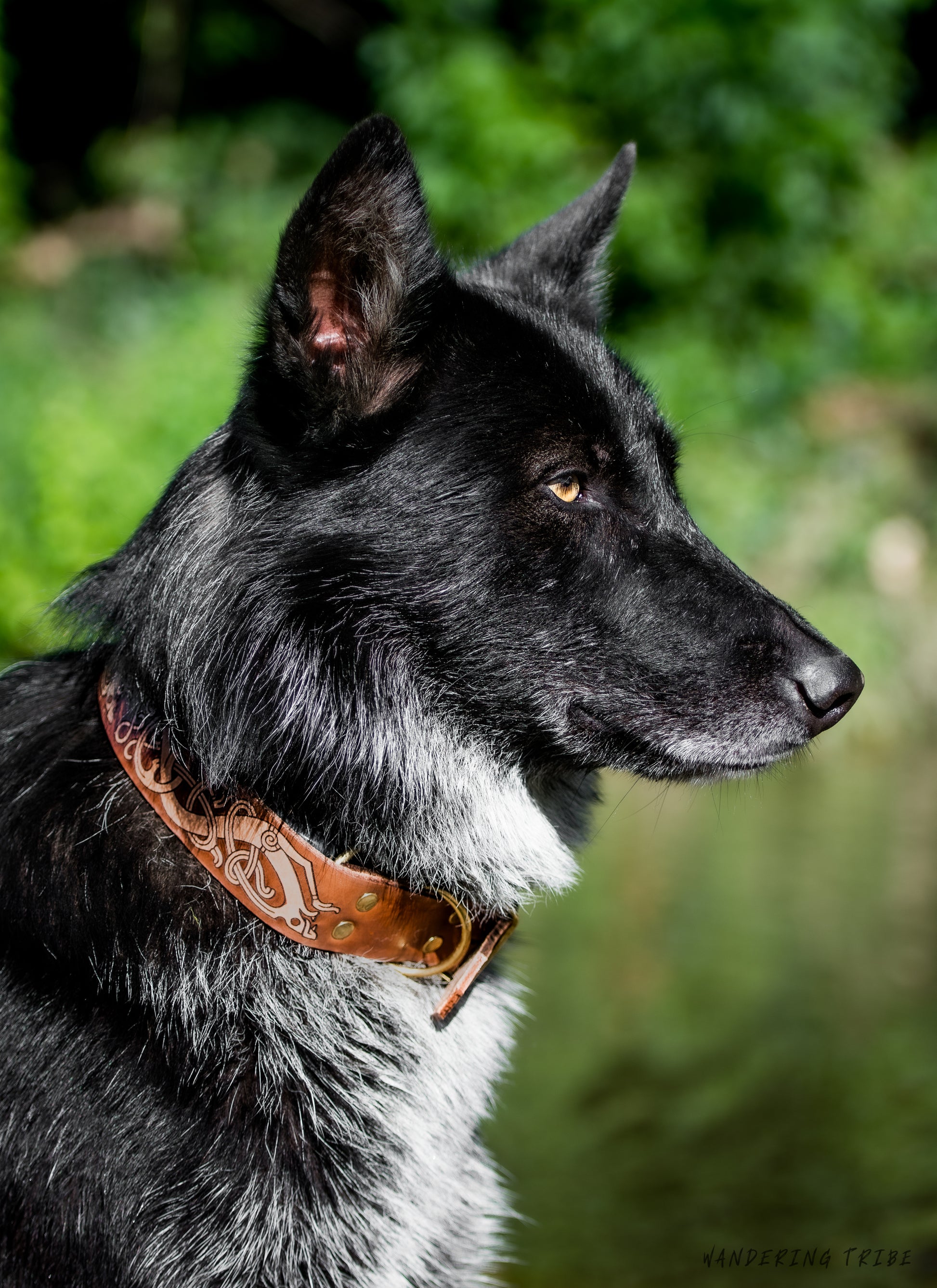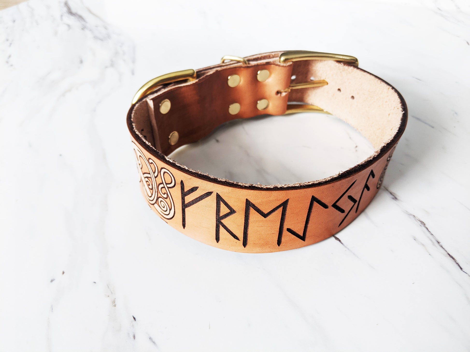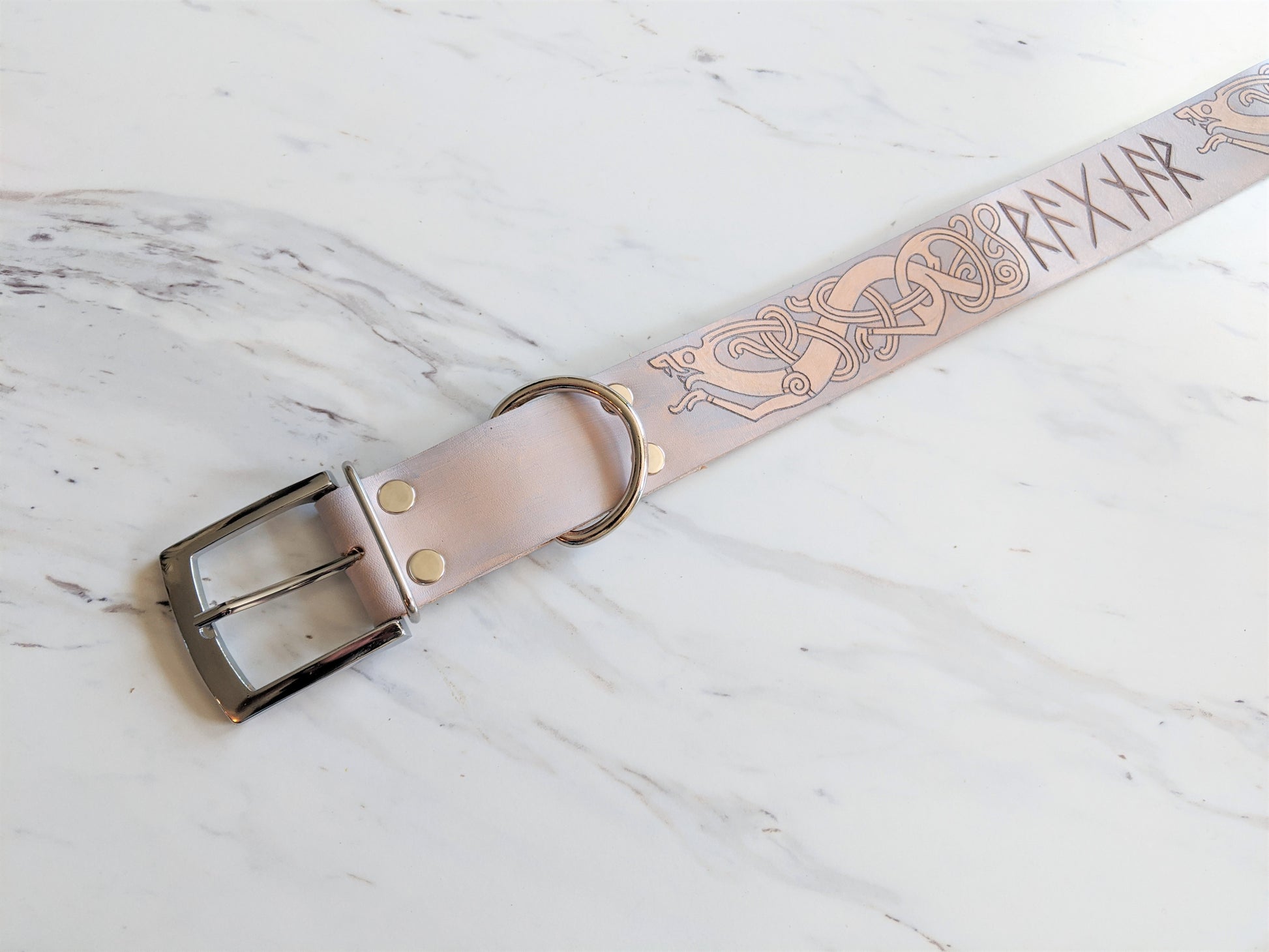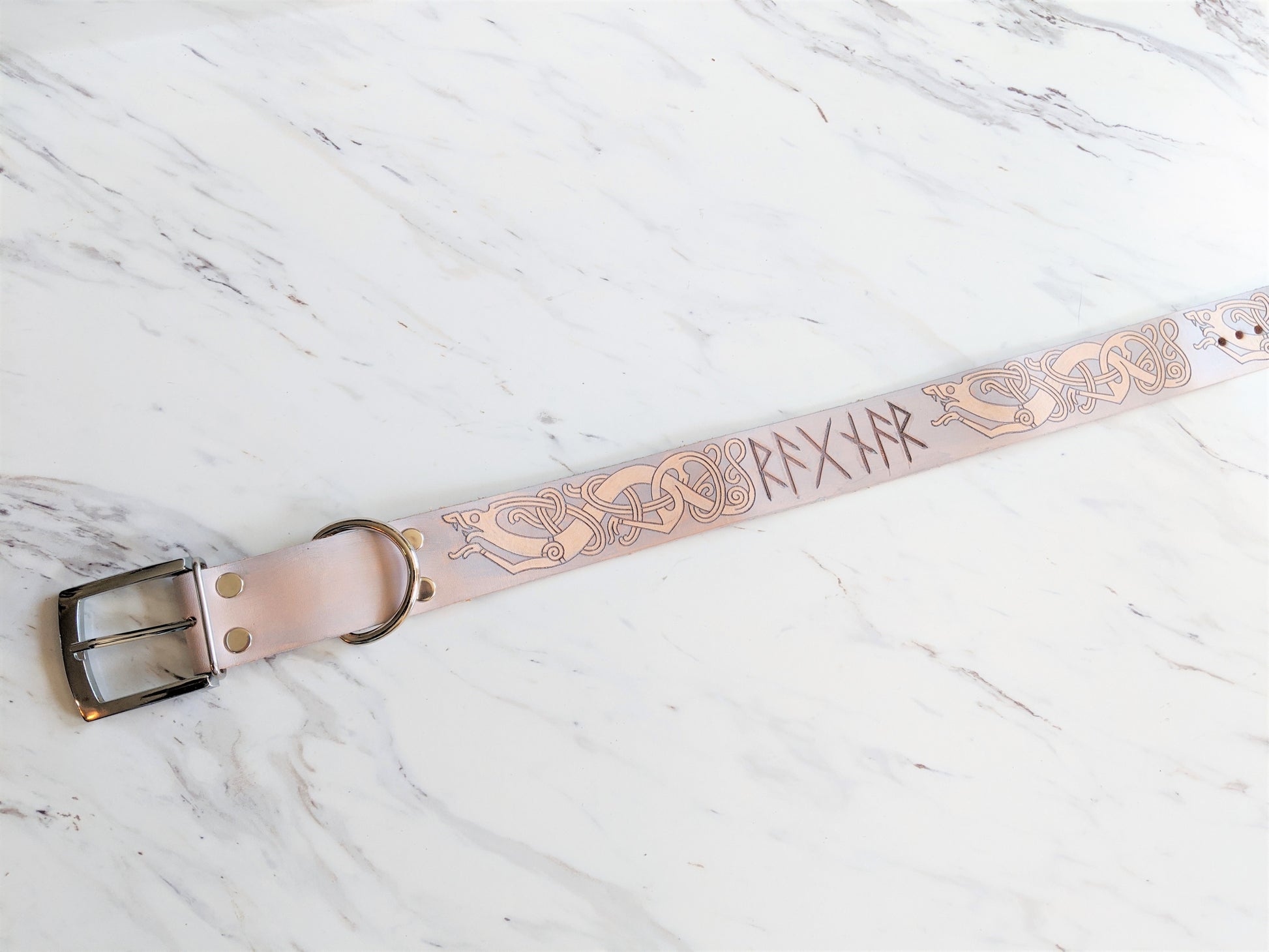 Custom handmade Leather collar with a knotwork Norse design of Fenrir.