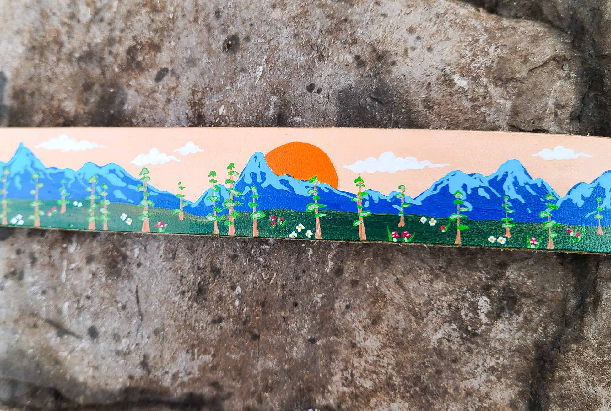 Custom handmade Leather lanscape collar featuring mountain ranges, trees and tiny mushrooms.
