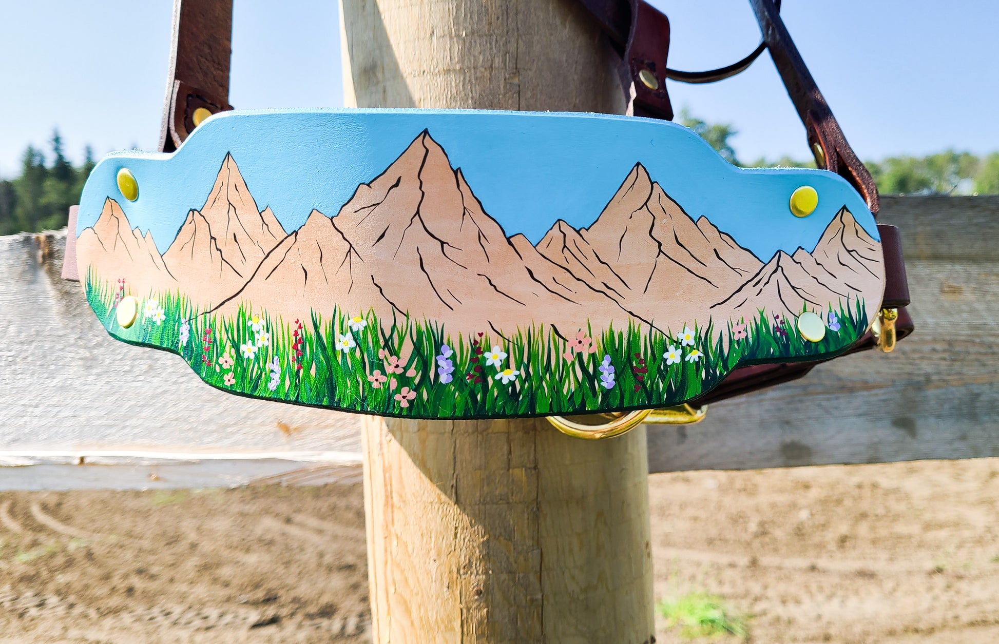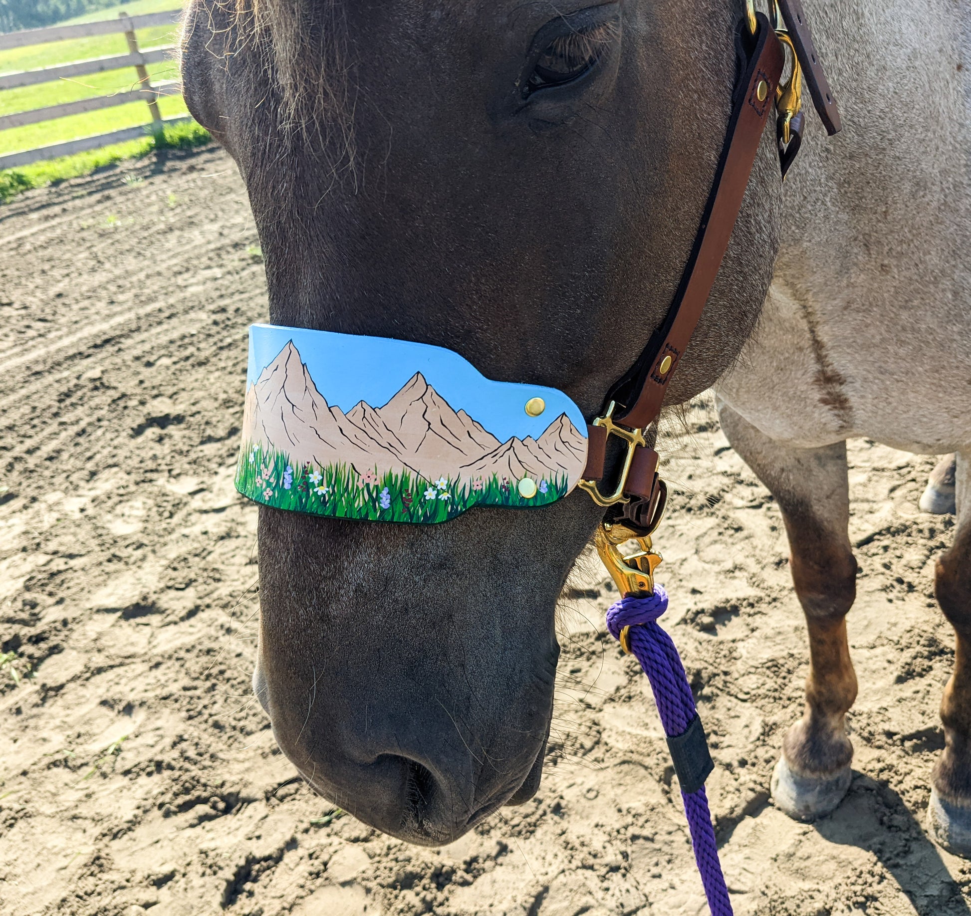Handmade Leather Horse Halter. This halter features our mountain wild flower design. Made with 1 inch wide straps with a 10-12 oz high quality vegetable tanned leather. Hand painted design with engraved line work. Painted with high quality leather paints and dyed with Fiebings leather dyes. Finished with Fiebings 4 way care conditioner and a resolene top coat. All hardware is brass or stainless steel. Double set rivets and stitching for a extra strong hold. One buckle on the head strap and one under the jaw to make it adjustable to fit perfectly. Nose band is attached with screw posts to be able to interchange nose bands.