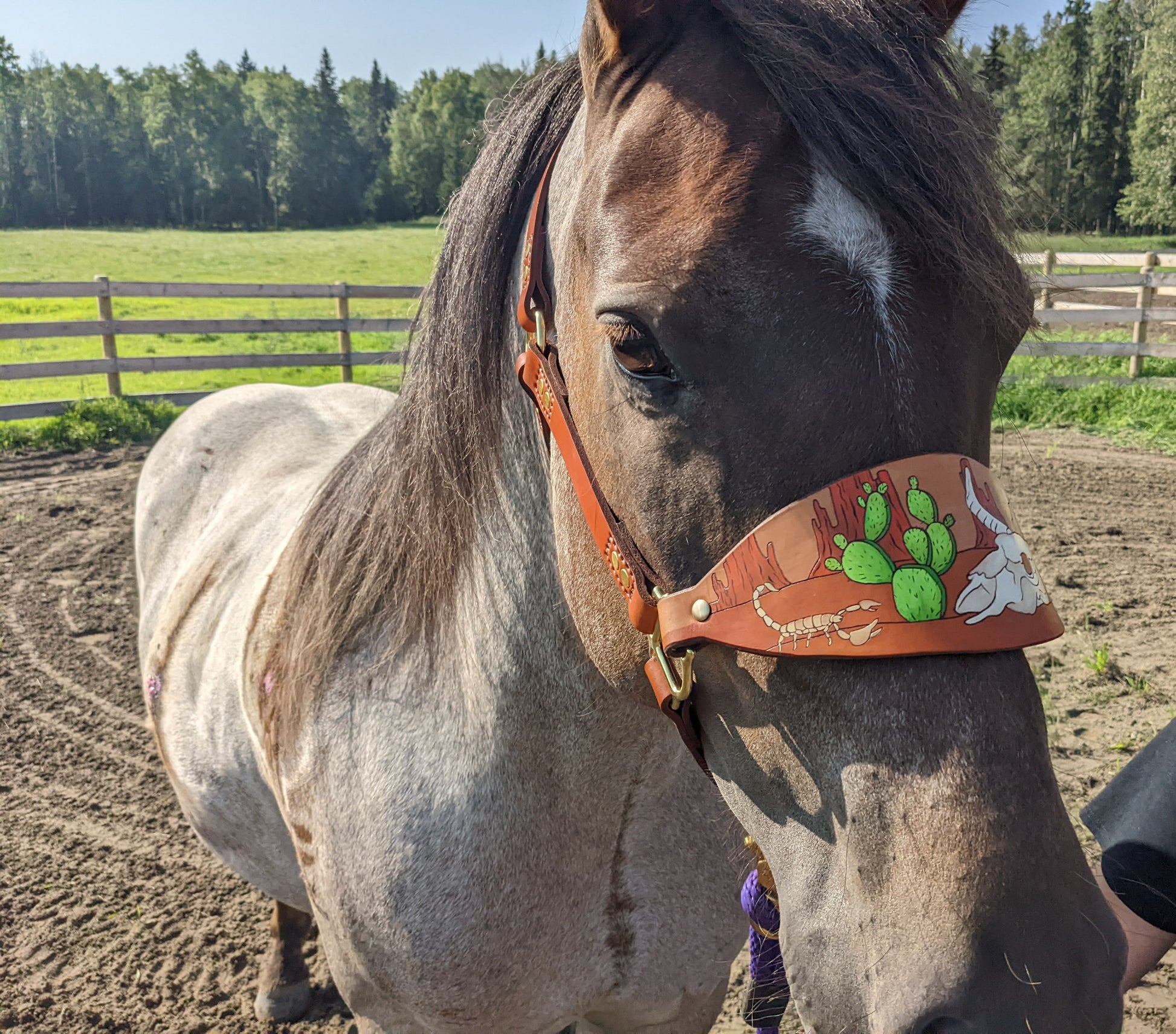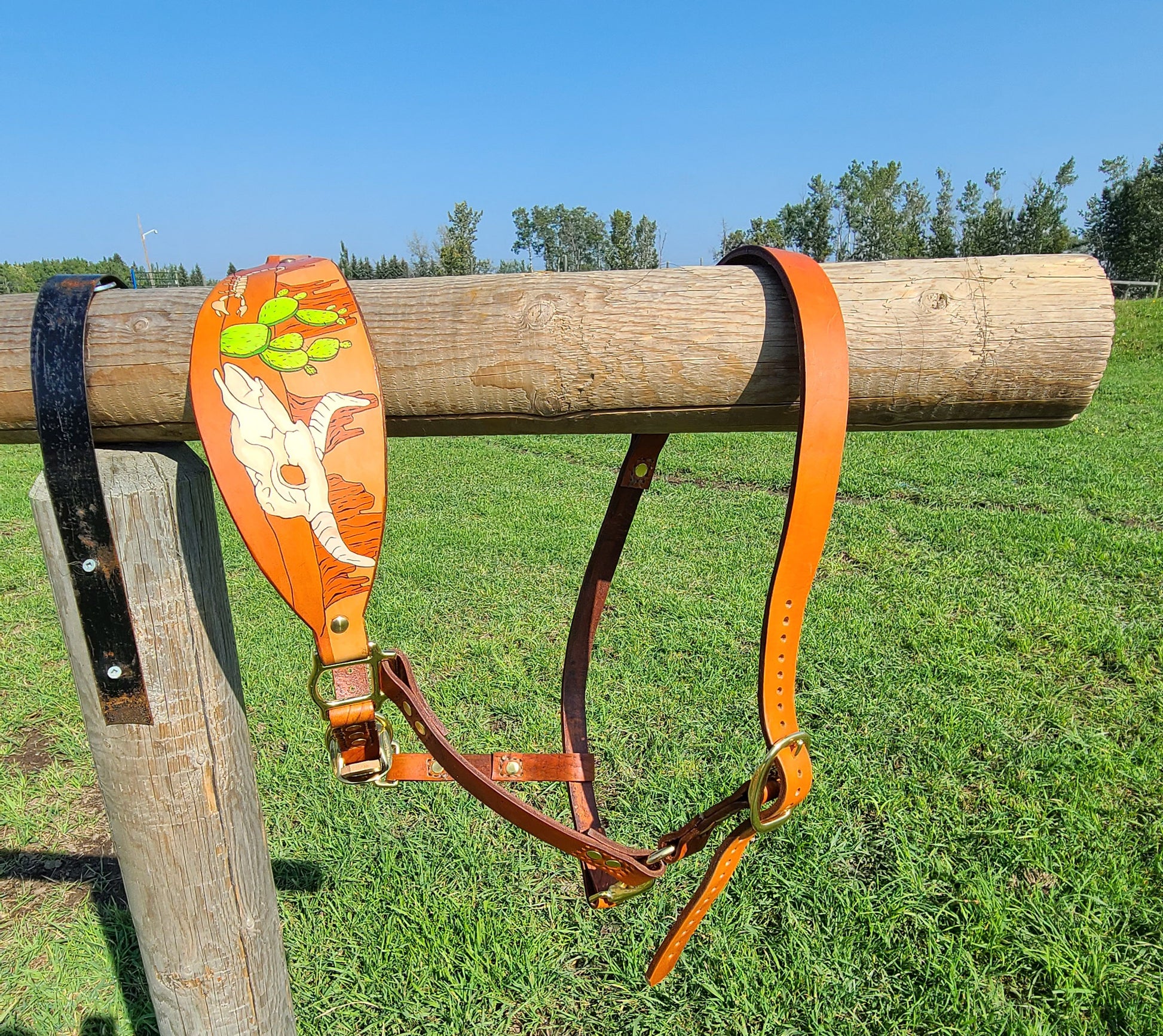 Handmade Leather Horse Halter. This halter features our Western Cactus design. Made with 1 inch wide straps with a 10-12 oz high quality vegetable tanned leather. Hand painted design with engraved line work. Painted with high quality leather paints and dyed with Fiebings leather dyes. Finished with Fiebings 4 way care conditioner and a resolene top coat. All hardware is brass or stainless steel. Double set rivets and stitching for a extra strong hold. One buckle on the head strap and one under the jaw to make it adjustable to fit perfectly. Nose band is attached with screw posts to be able to interchange nose bands.